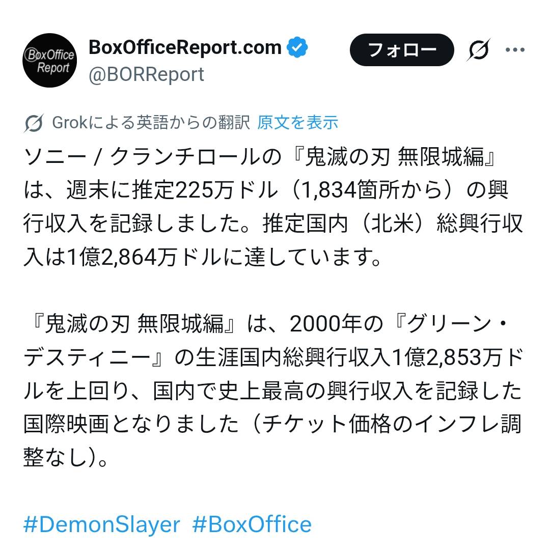 [討論]《鬼滅之刃無限城篇》破220億登日本影史第【影史票房】年度最強動畫《「鬼滅之刃」無限城篇 第一章 猗窩座再襲》日本續寫影史票房新頁!繼 日前以176億登上日本影史最高票房電影Top10後,截至山之日(8/11) 假期結束,上映25 天觀影人數達1569萬8202人次,總票房達到220億7219萬1500日元,接連超越《霍爾的移 動城堡》《魔法公主》《哈利波特》《紅髮歌姬》登上日本影史票房第六名;本週適逢盂![[討論]《鬼滅之刃無限城篇》破220億登日本影史第 [討論]《鬼滅之刃無限城篇》破220億登日本影史第](https://pbs.twimg.com/media/GyH83XybMAA3H17.jpg)