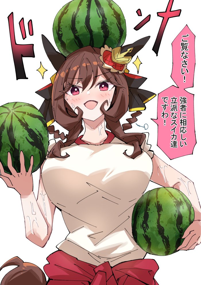 貴婦人一手拿一顆西瓜、頭上還頂著一顆,說: