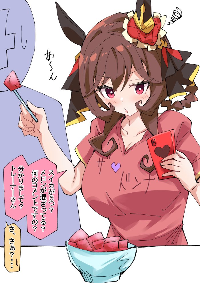 貴婦人右手叉了一塊西瓜要餵訓練員,看左手上的手機,問訓練員: