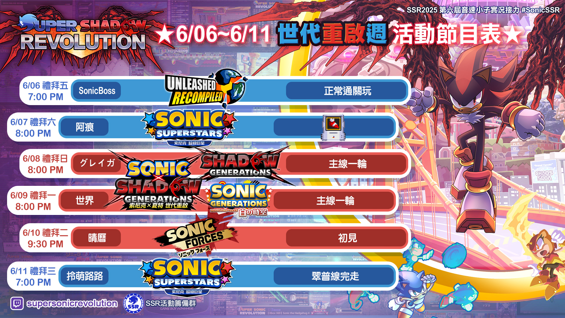 [實況] 第六屆SSR音速小子接力實況 6/6~11節目表