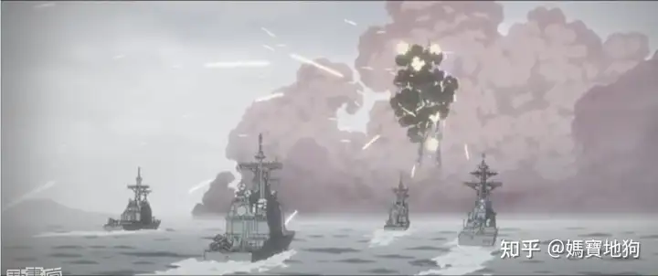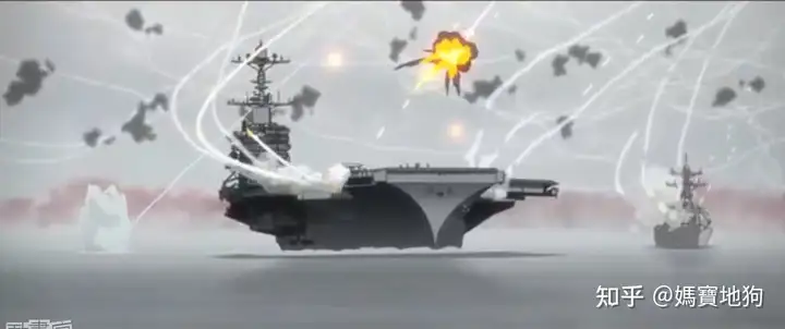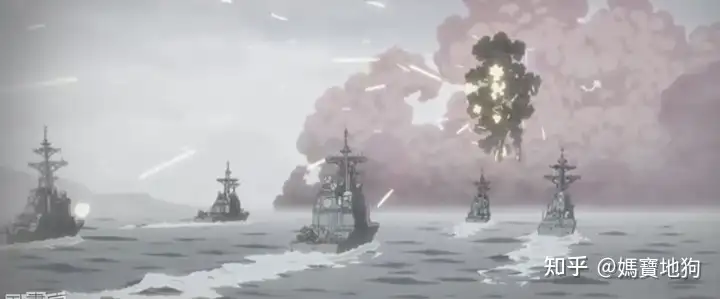 在實際作戰上,作戰船隻之間、航母與其護衛船隻的相距距離會拉開到視距外,可能相距幾十公里到上百公里;不會像動畫中排的那樣近,也不可能被一發光炮端掉一大堆船,這又是一個錯誤;你在照片上看到航母作戰群都擠在一起,其實那只是在擺拍。