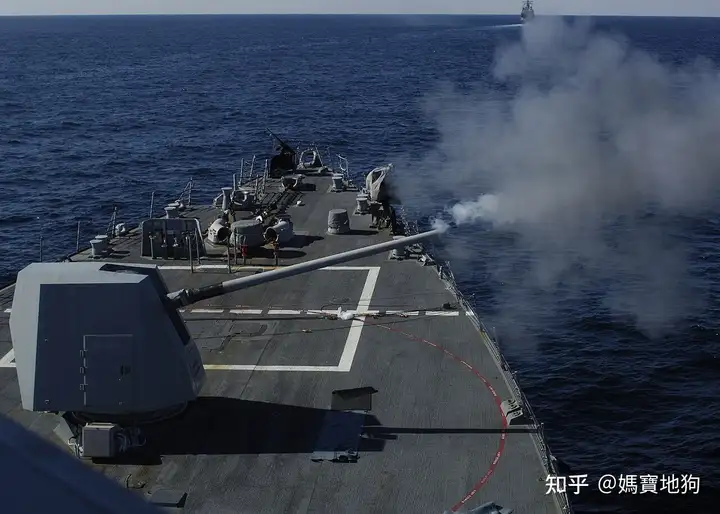 不管是金剛級護衛艦、柏克級驅逐艦還是提康德羅加級飛彈巡洋艦,基本武裝就是奧托布127mm艦炮、方陣快炮(柏克級驅逐艦沒有)、一套Mk 41 Mod 6垂直發射系統單元;可發射標準2、標準3、標準6型防空飛彈與RUM-139 阿斯洛克反潛導彈;從畫面中,我們可看到奧托布127mm艦炮一直以高仰角發射,推斷船隻距離尼爾瓦修可能不到30公里(奧托布