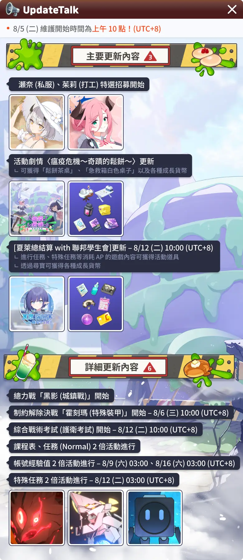 [蔚藍]國際服8/6更新日誌▎8/6(二)更新日誌搶先看 各位老師好, 這裡要事先告訴大家8月6日(二)更新的重要內容。 ‧時間: 8/6(二)10:00~15:00 ‧影響: 維護期間內無法登入遊戲![[蔚藍]國際服8/6更新日誌 [蔚藍]國際服8/6更新日誌](https://i.imgur.com/Ui38H9wb.jpeg)