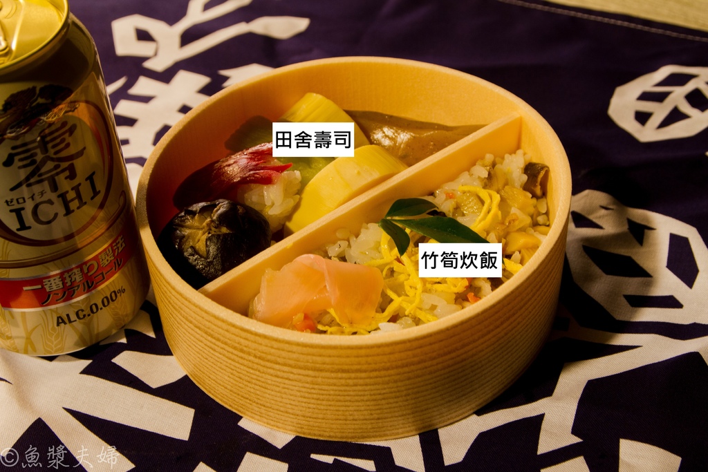 另一邊則是滷煮香魚,骨頭燉得酥軟,跟內臟的甘苦一起同吃,搭上酸溜的紅薑與醃茗荷解膩,還有一塊飯後的新鮮柿子。下層則是以主食為主,田舍壽以山蔬做為壽司料,我個人特愛蒟蒻壽司,即是仿稻荷壽司之感,口感很特別。竹筍炊飯則是把筍子的鮮甜煮入飯中,吃時突然一口甜蜜令人驚喜,原來是蜜過的栗子。