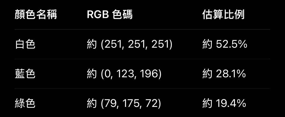 請GPT分析顏色比例發現綠色只有19.41%,白色有52.5%耶!