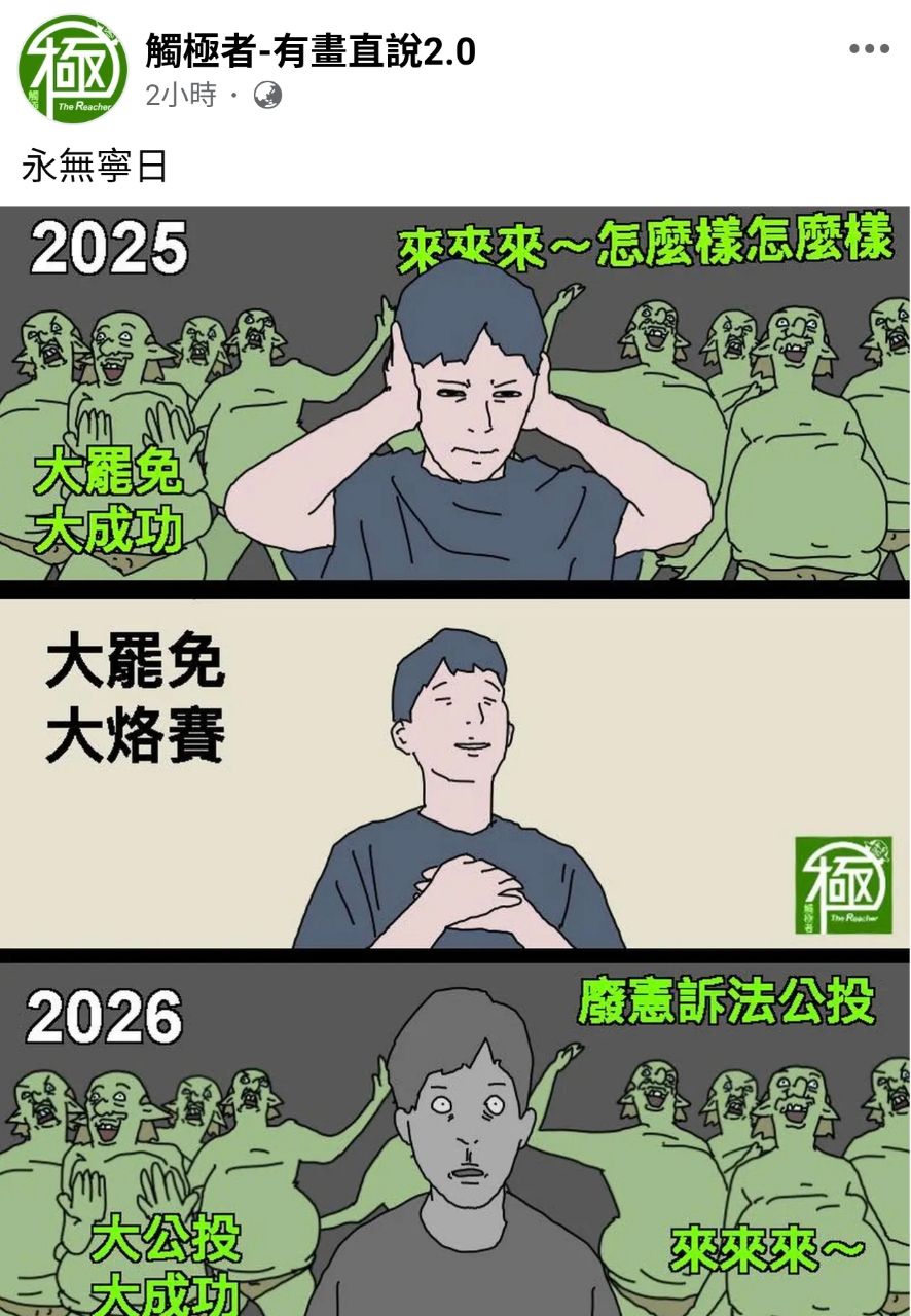 : 隨著藍白陣營將公投從「鳥籠」中放出,公投已成為朝野政治對決的新武器。大罷免進入: 2.0延長賽的「大公投」階段,勢必將牽動2026年選情發展,成為政黨角力的新戰場。