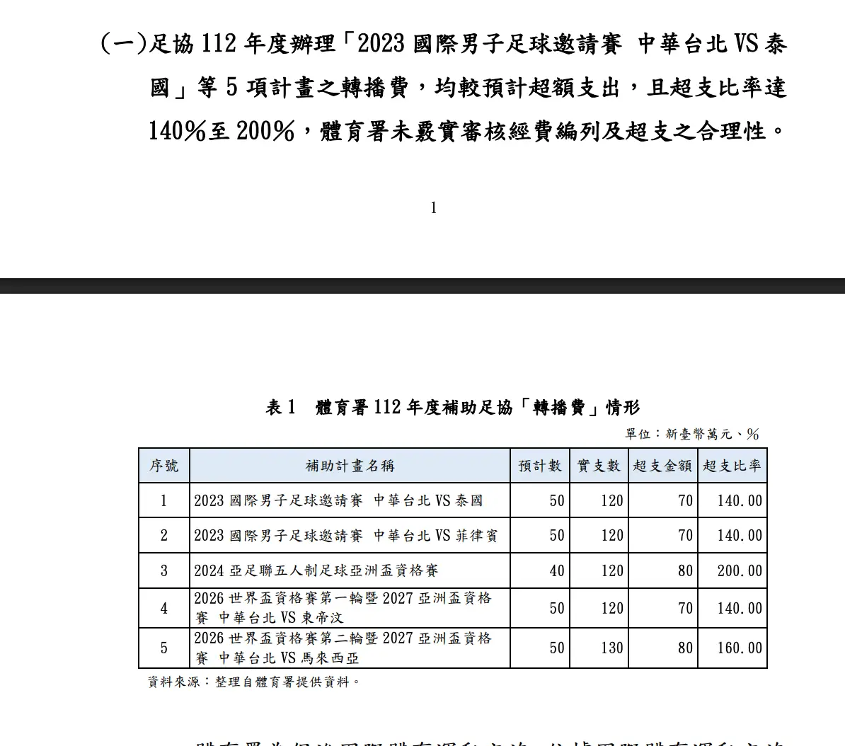 足協112年度辦理「2023 國際男子足球邀請賽 中華台北 VS 泰國」等 5 項計畫之轉播費,均較預計超額支出,且超支比率達140%至 200%,體育署未覈實審核經費編列及超支之合理性。