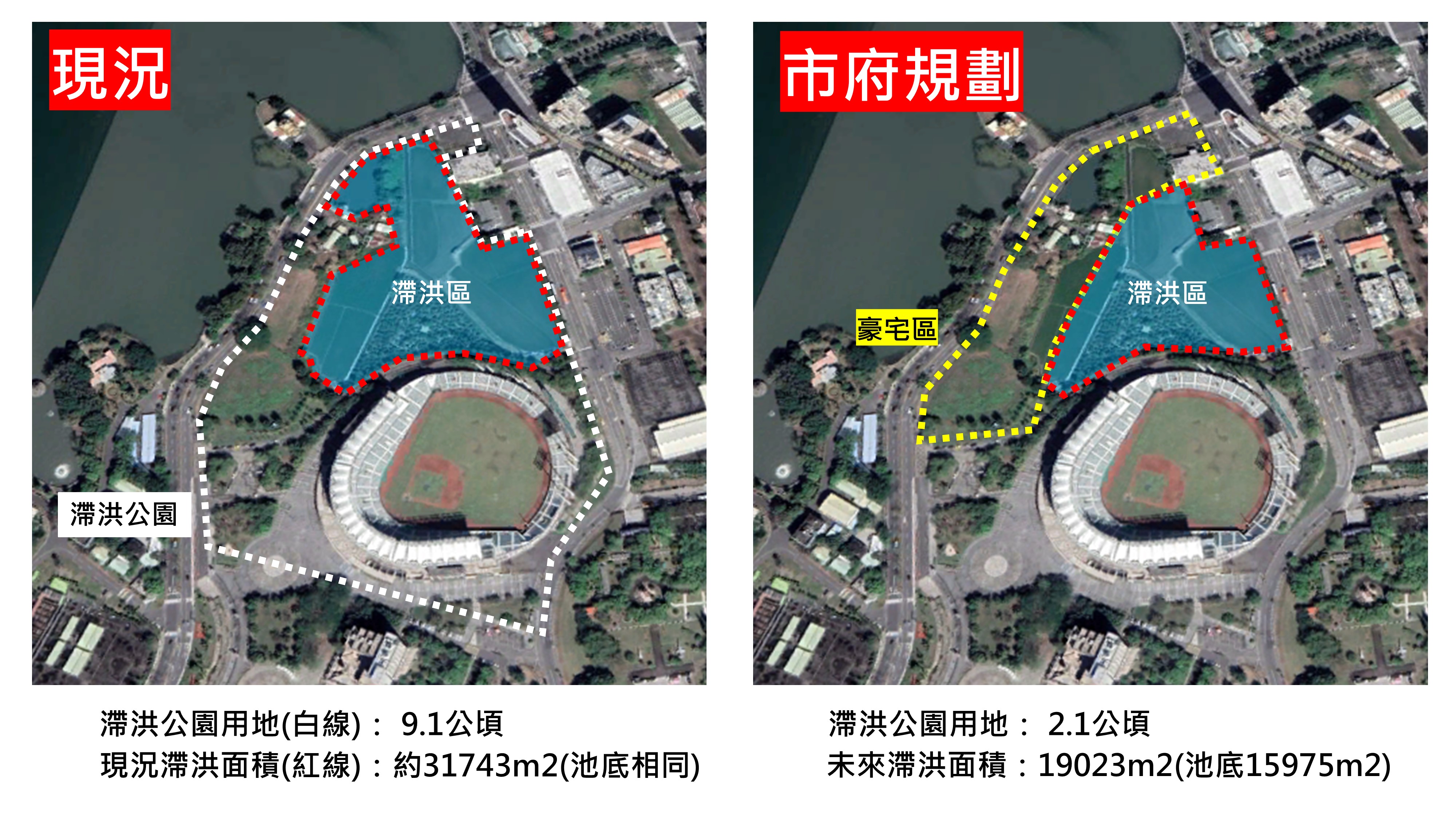 高雄市政府說這裏並沒有水患問題,計畫範圍內也不是淹水潛勢區,但還是設了4萬5千立方公尺的滯洪池。但重點不是「計畫範圍內」,而是一塊本來可以滯洪的土地,開發後滯洪功能不見了,洪水就會往四處流造成鄰近地區淹水,這就是森林城市協會理事長莊傑任說的「以鄰為壑」。