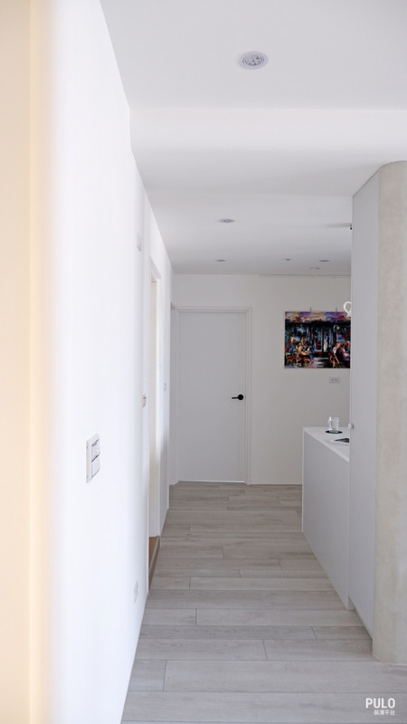 玄關原本有造型天花板和門框,設計師拆除後,改以平釘天花板結合嵌燈,空間變得平整寬敞。