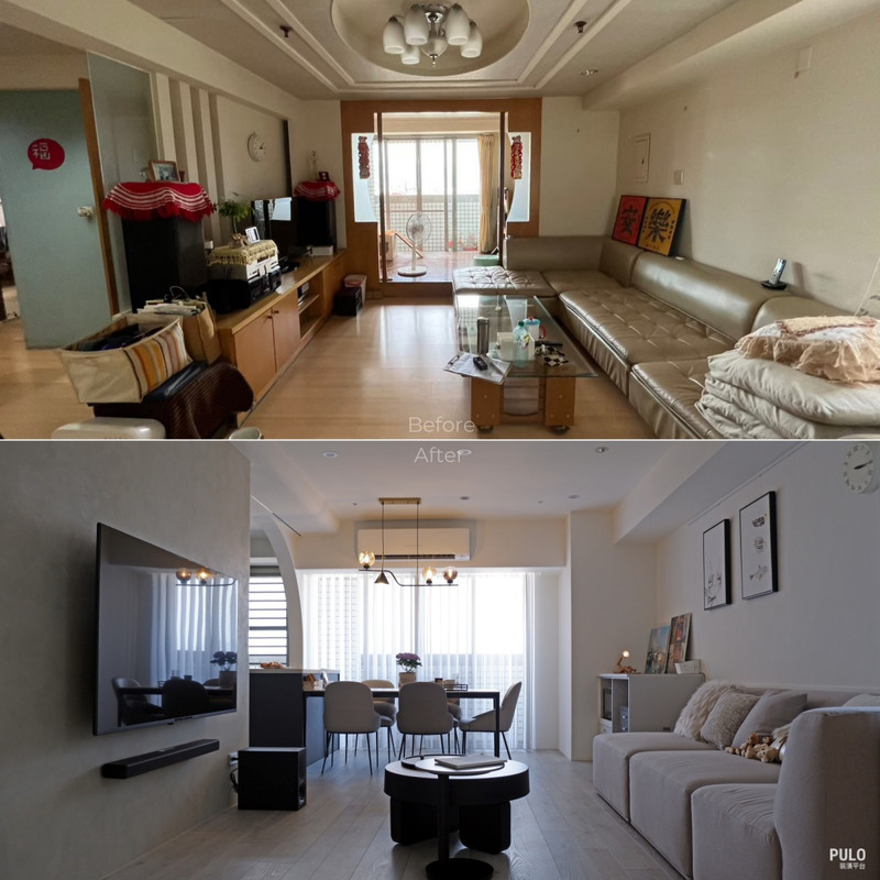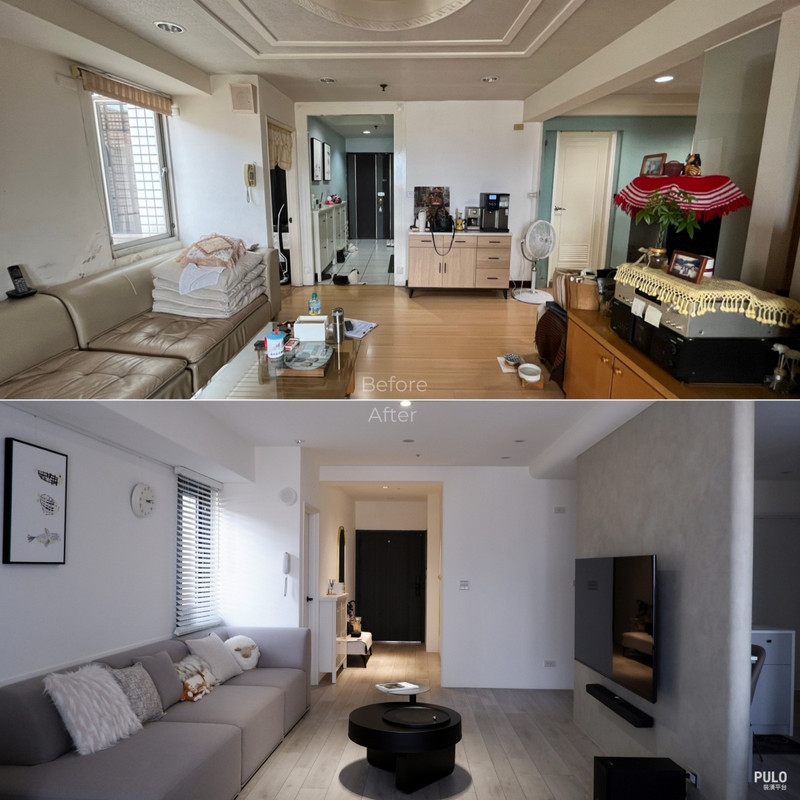 換上新的天花板和油漆,地板也換成全新的材質,客廳看起來乾淨明亮,整體更有新家的感覺。