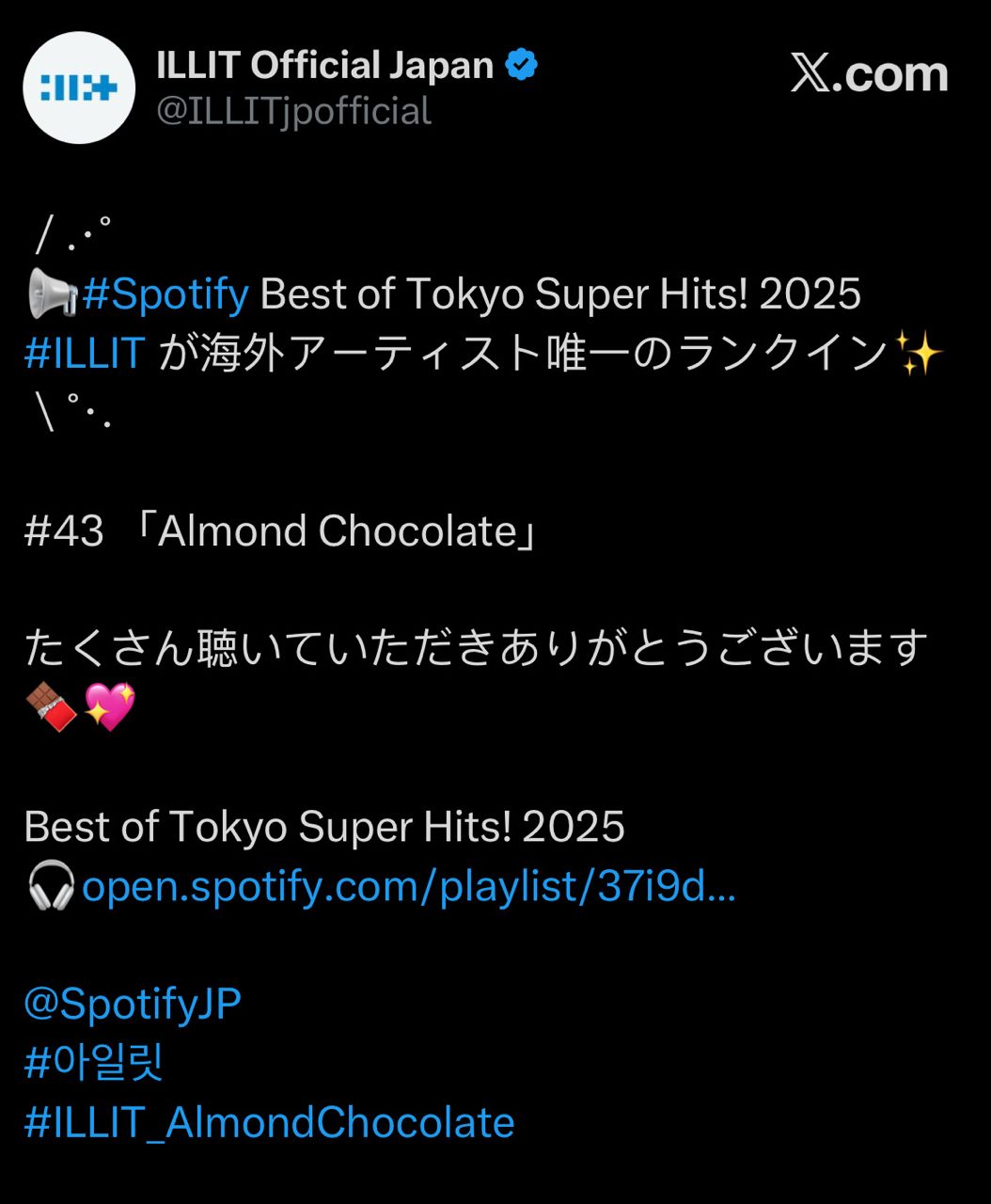 另外ILLIT也成為Spotify Best of Tokyo Super Hits! 2025唯一入榜的海外藝人