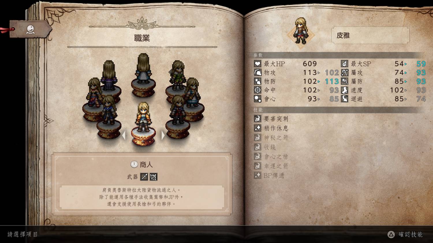戰鬥方面採用手遊版的八人前後衛組合,角色技能組也各有不同。比如一二代的學者職是三屬任我行,這次初期入手的女學者則是雷暗二屬,稍微沾了點手遊版角色設計的趣味性。
