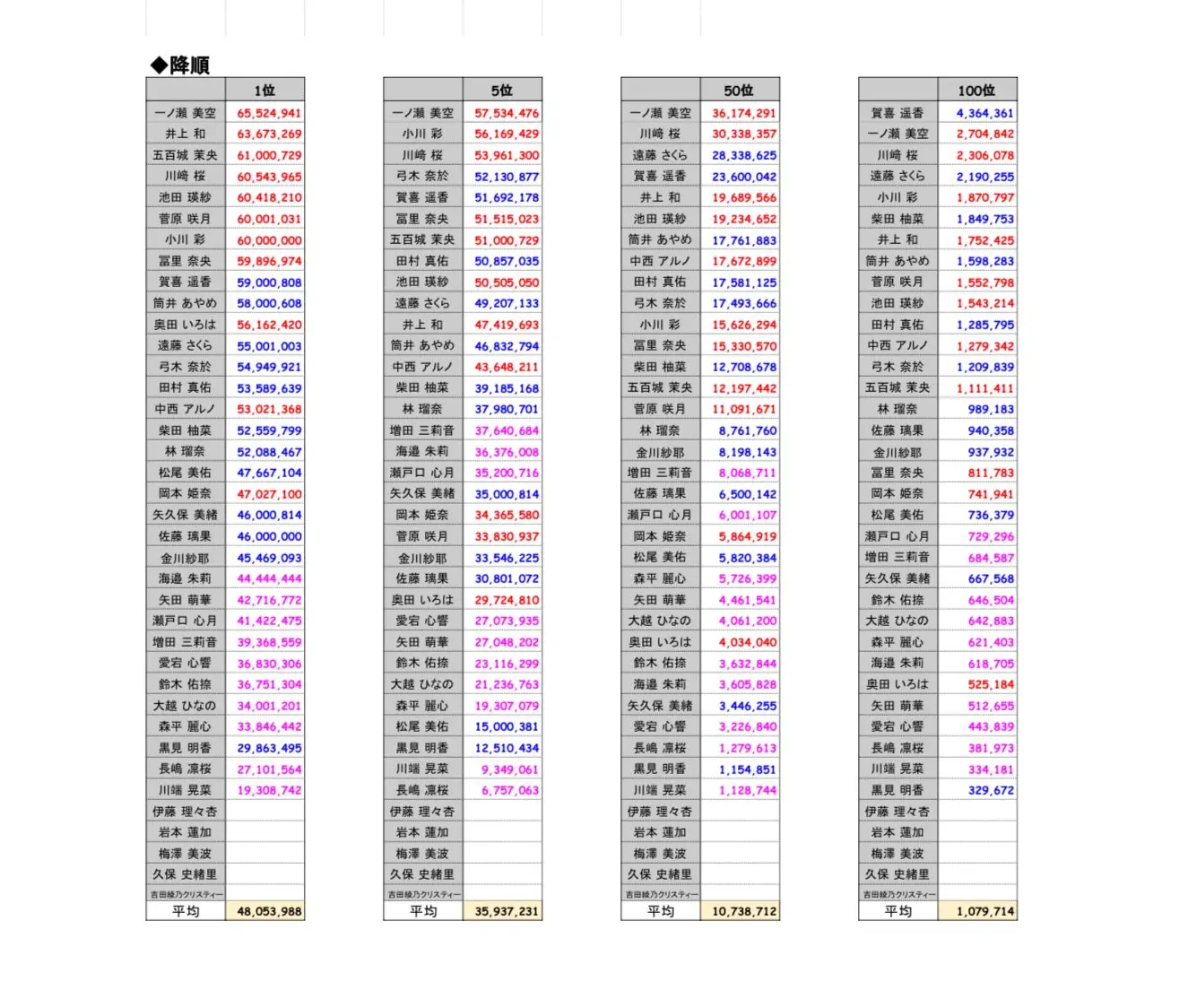 1,700~1,800萬:筒井あやめ、田村真佑、弓木奈於