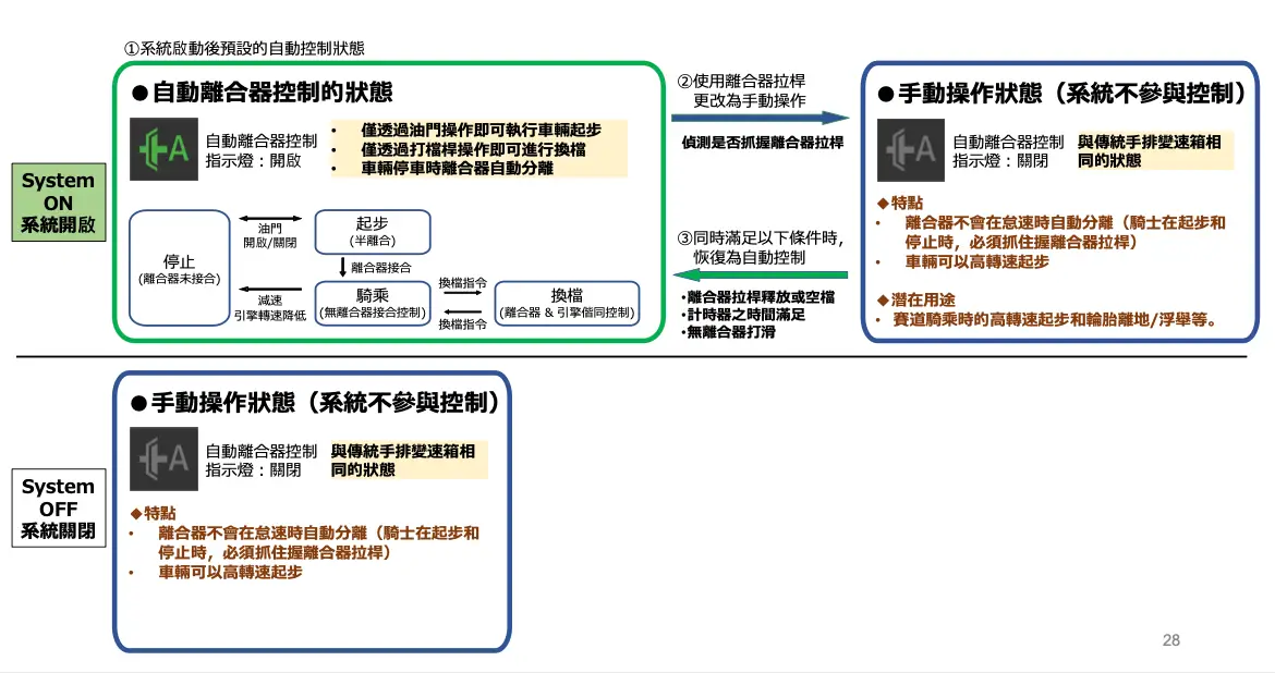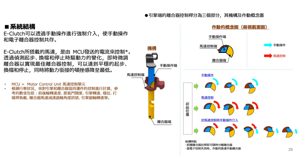 E-Clutch的系統設計很棒 甚至不需要特意去關閉 可以隨時接管離合器操作 他使用機械結構設計
