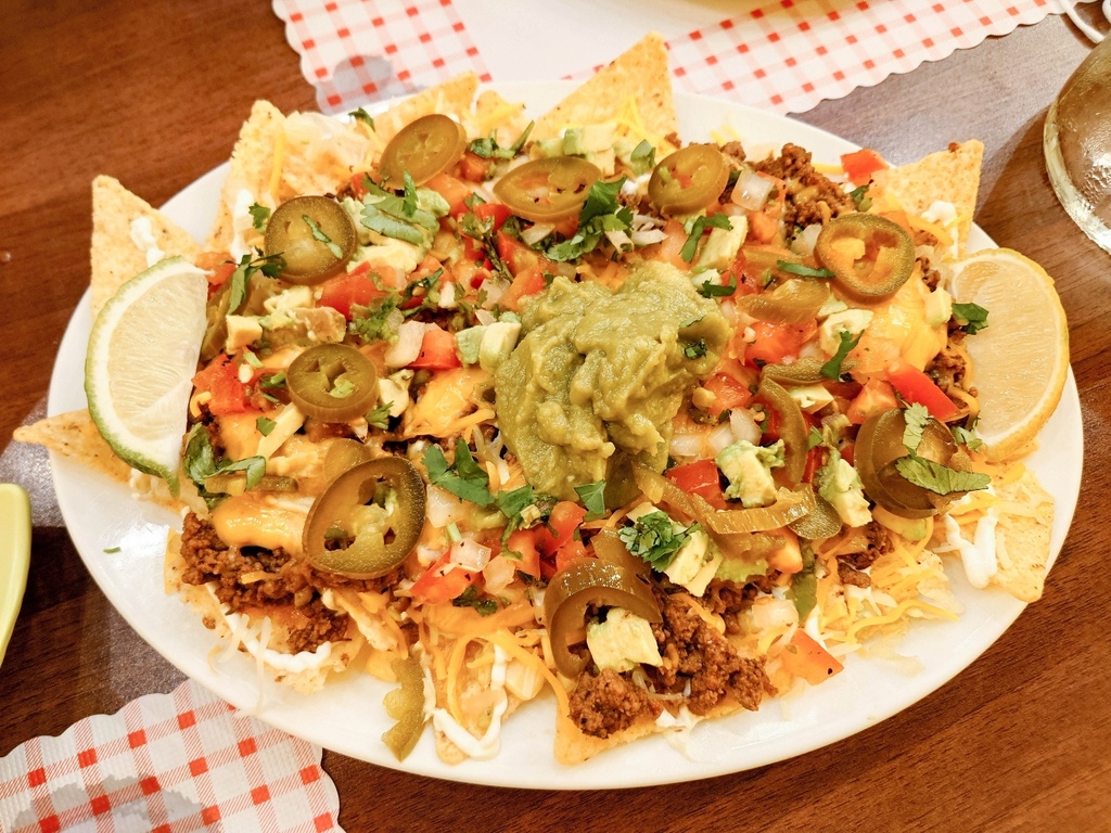 墨西哥玉米脆片搭配牛絞肉、起司、番茄莎莎醬、墨西哥辣椒、酪梨、新鮮洋蔥、番茄丁、香菜等,