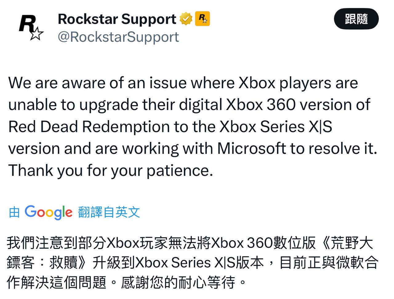 Rockstar沒上Xbox One原生版才沒有沒有繁中,當時Xbox