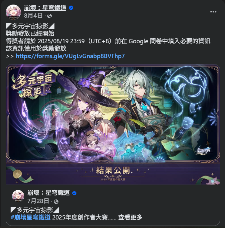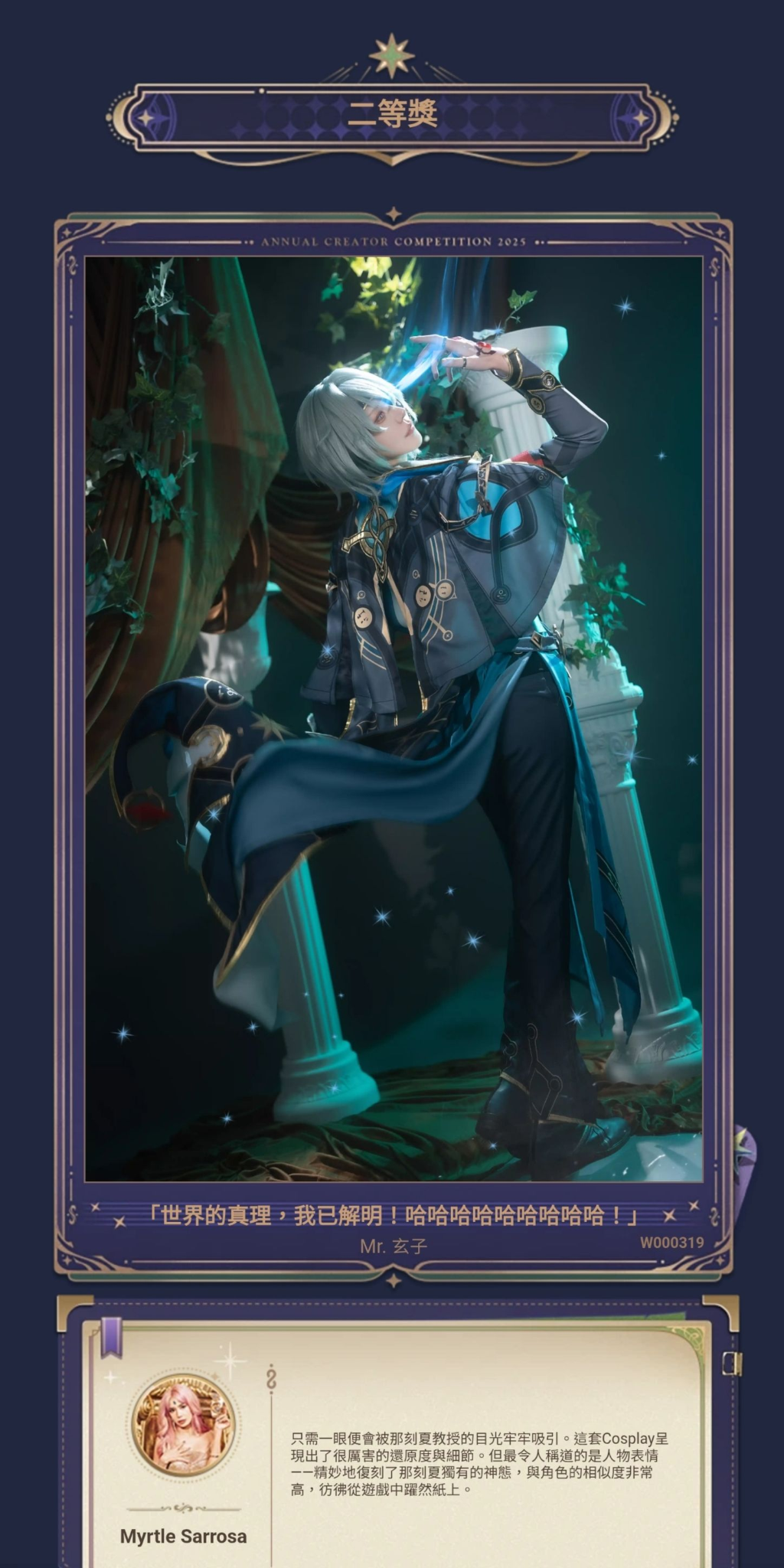 參加《崩壞:星穹鐵道》2025「多元宇宙掠影」官方同人比賽,作品在 Cosplay 區獲得了二等獎(2000 美金獎金)以及人氣獎。照理說應該是值得開心的事,但最後卻變成完全領不到獎金。