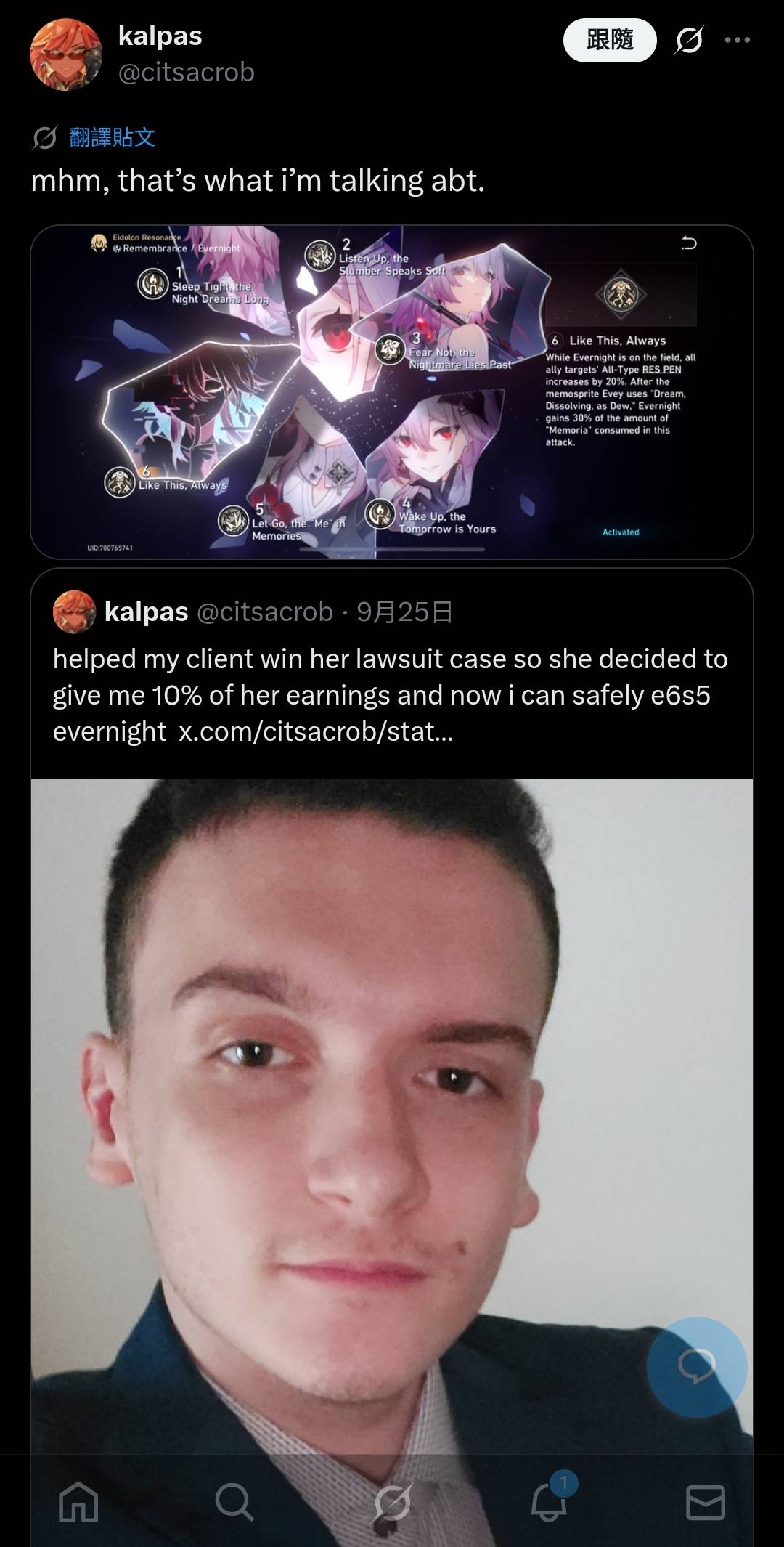 「幫我的客戶打贏了官司,她決定把她收益的10%都給我,這下我可以穩穩地給長夜月抽到6+5了」